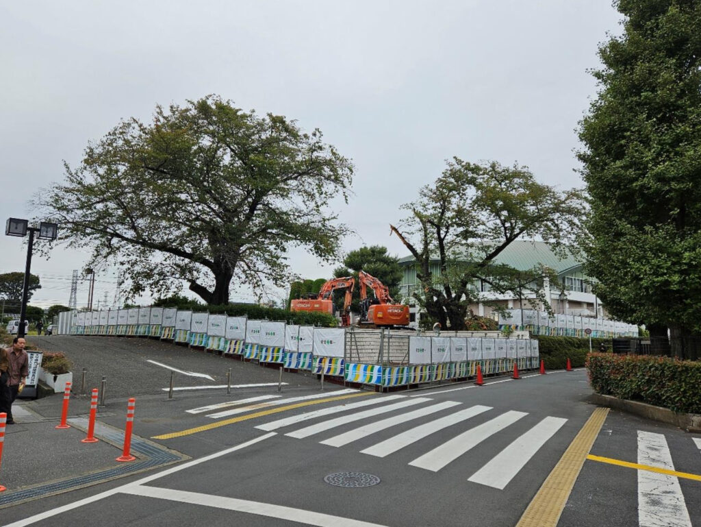 古木となり、危険性もあることから伐採、伐根が決まっていた体育館前の桜の木が、10月中旬からその作業が始まりました。